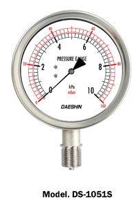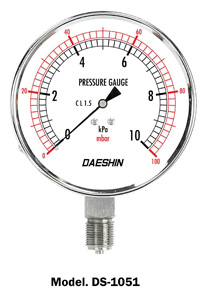 DS-1050 Series는 브루동관 압력계로서는 측정할 수 없는 낮은 압력을 측정하기 위하여 특수하게 설계 제작된 계기로서 Element는 Chamber로 하고 있습니다. 각종 가스 배관의 압력 측정 등에 쓰이거나 각종 용도의 미세한 압력 측정에 주로 쓰이고 있습니다.
