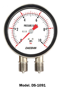 DS-1090 Series는 두 개의 압력계를 한 개로 합쳐 놓은 구조로서 두 개의 압력 도입구, 두 개의 Bourdon관, 두 개의 지시침 및 2종의 확대 기구 등으로 구성되어 2개소의 압력을 하나의 계기로 동시에 측정할 수 있는 압력계입니다. 이 계기는 설치 장소가 제한되어 있는데 주로 철도 차량용에 쓰이며 내구성이 높습니다, 두 개의 압력 전위차를 통해 차압측정이 가능합니다.