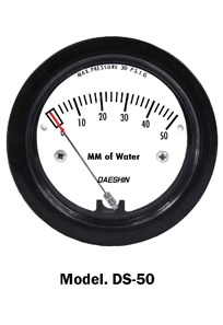 DS-50 Series는 Dial Type의 Differential Pressure Gauge로 깔끔한 디자인과 작은 크기, 충분한 정밀도를 갖추어 대부분의 요구 응용분야에 대응할 수 있습니다. 압력접속구가 L(저압측)과 H(고압측)이 있으며 2개소의 압력차(차압)를 지시하는 것으로써 차압의 측정은 물론, 그 측정된 차압으로 액면과 유량의 측정 등에 사용 할 수 있습니다. 공기 필터의 차압측정, 압력차 응용 라인 등에 주로 쓰여지고 있습니다.